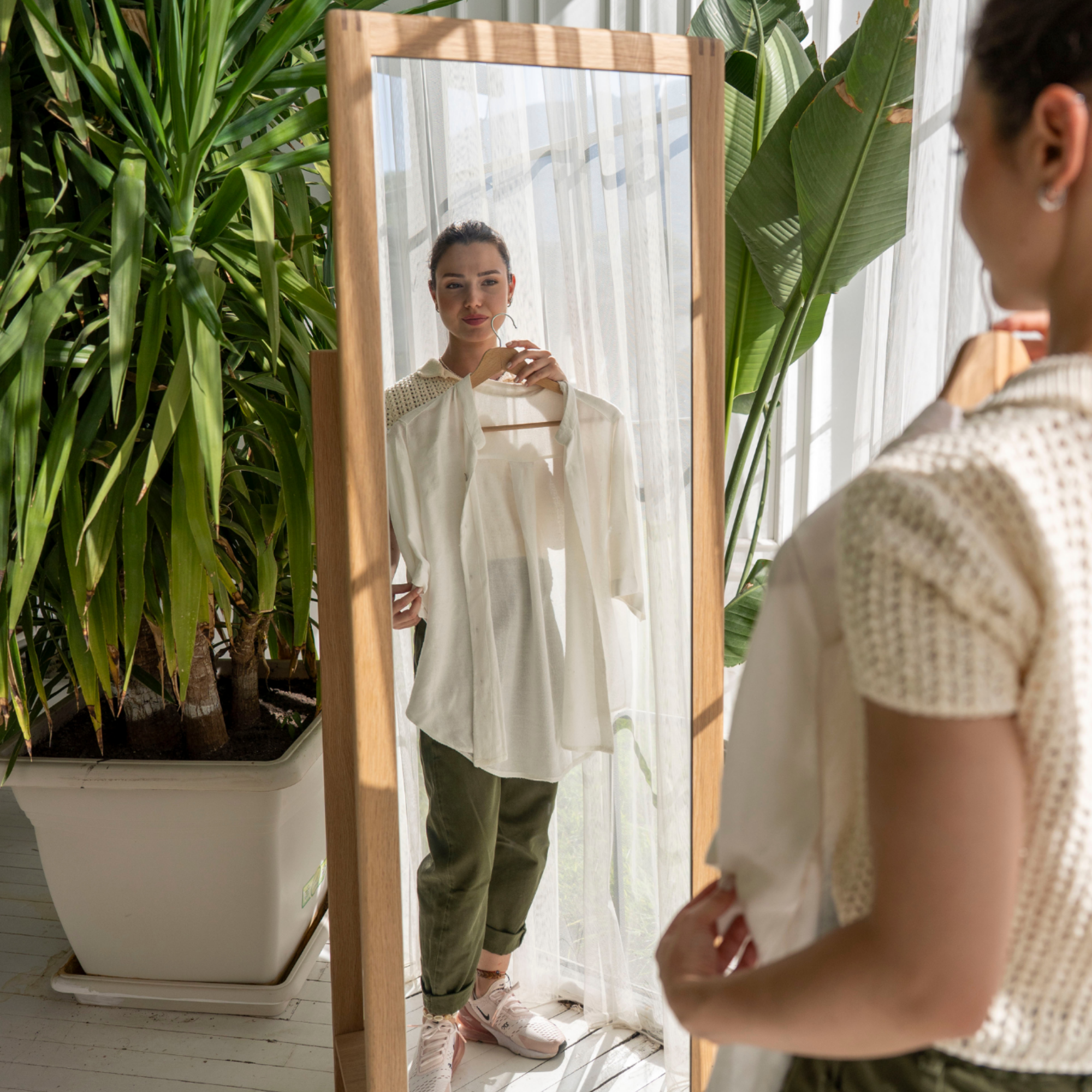 Geniş formu ve sade çizgileriyle Modesto, bulunduğu ortama ışık ve denge getirir. İster duvara monte edilerek minimalist bir görünüm kazansın, ister üzerindeki askı detaylarıyla günlük kullanımda fonksiyonel bir parça hâline gelsin — Modesto, bulunduğu her alanda doğallığıyla öne çıkar. Bir duvara yaslandığında bile kendini belli eden o zarif duruşu, onu sıradan bir aynadan çok daha fazlası hâline getirir.