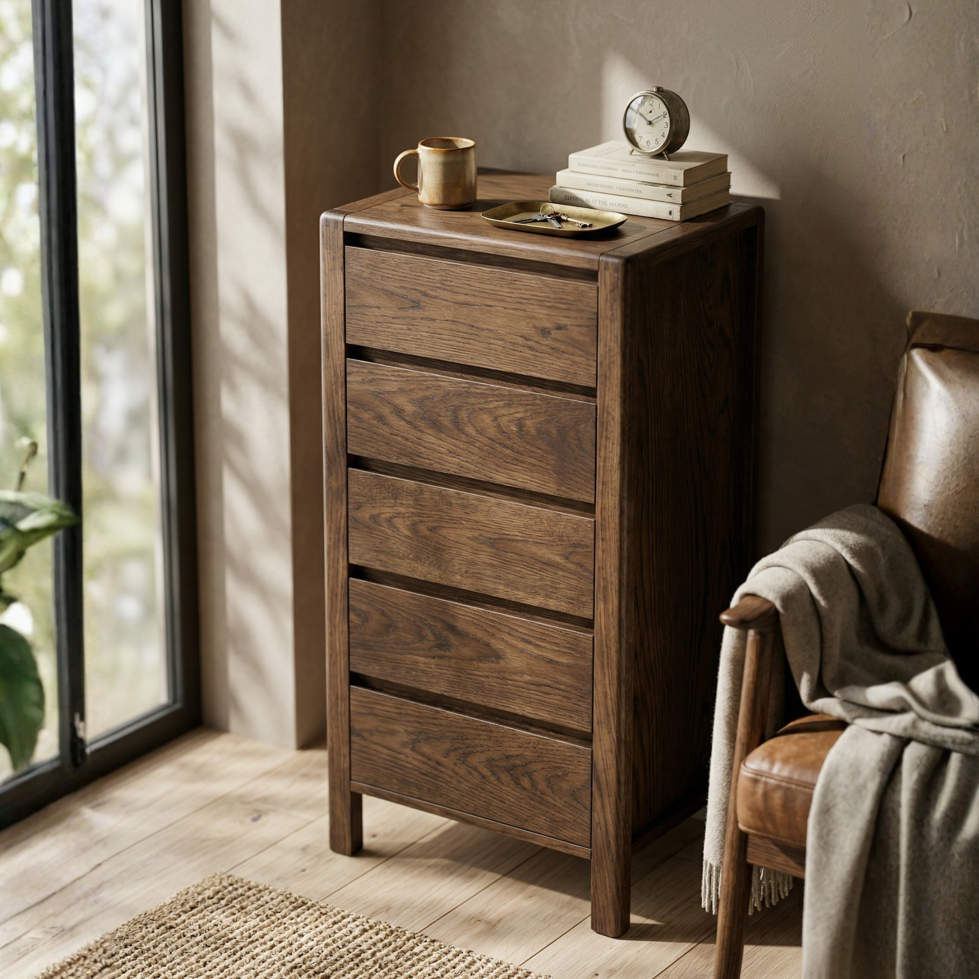 5 çekmeceli kullanım alanını ve estetiği birlikte sunan bu tasarım, Amerikan Kırmızı meşe masifin sıcak dokusunu dayanıklılıkla buluşturur. E1 Sertifikalı sunta üzerindeki Avrupa Kırmızı meşe kaplama, sağlıklı ve çevre dostu bir yapı sağlarken düşük formaldehit emisyonu ile insan sağlığını da koruyor.