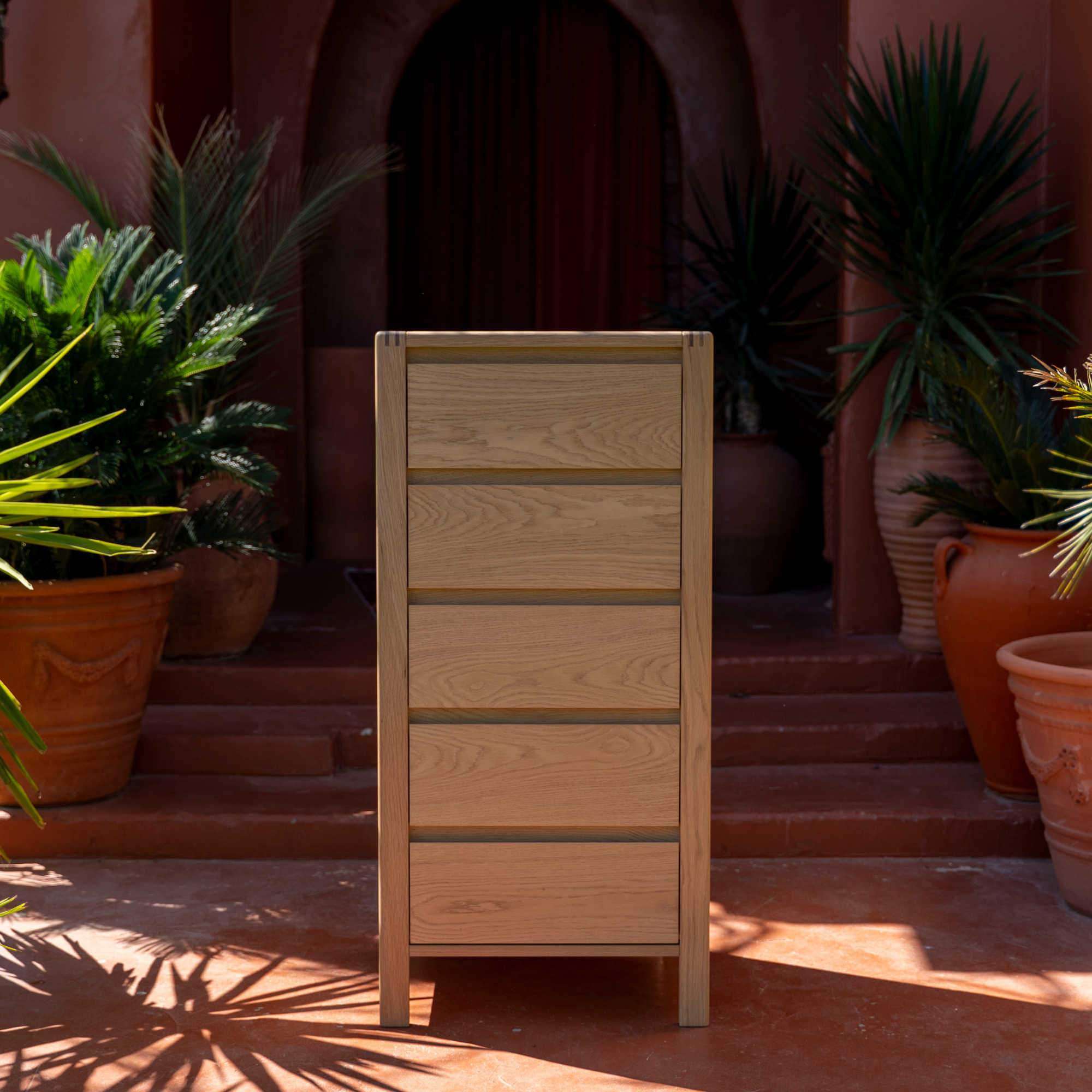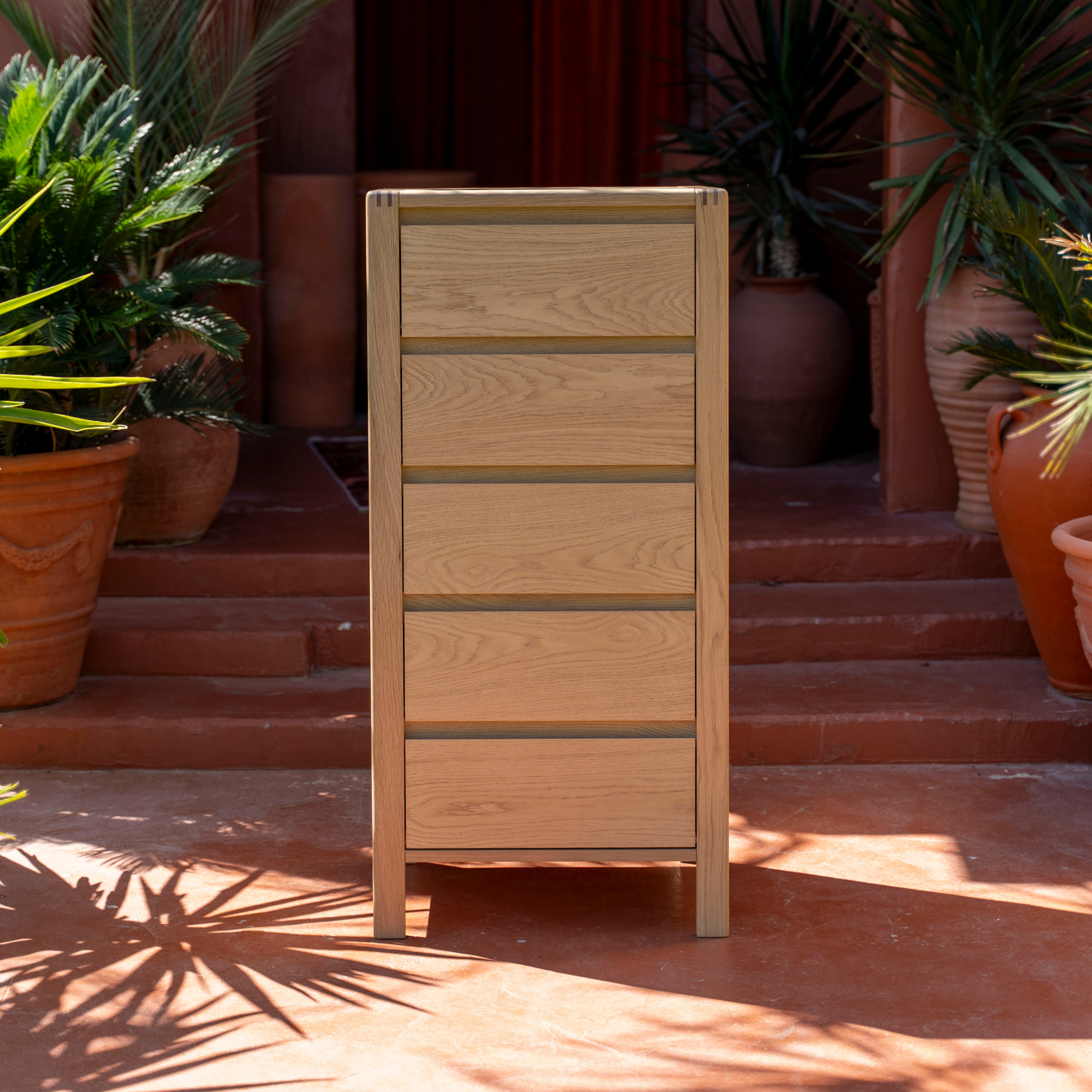 5 çekmeceli kullanım alanını ve estetiği birlikte sunan bu tasarım, Amerikan beyaz meşe masifin sıcak dokusunu dayanıklılıkla buluşturur. E1 Sertifikalı sunta üzerindeki Avrupa beyaz meşe kaplama, sağlıklı ve çevre dostu bir yapı sağlarken düşük formaldehit emisyonu ile insan sağlığını da koruyor.