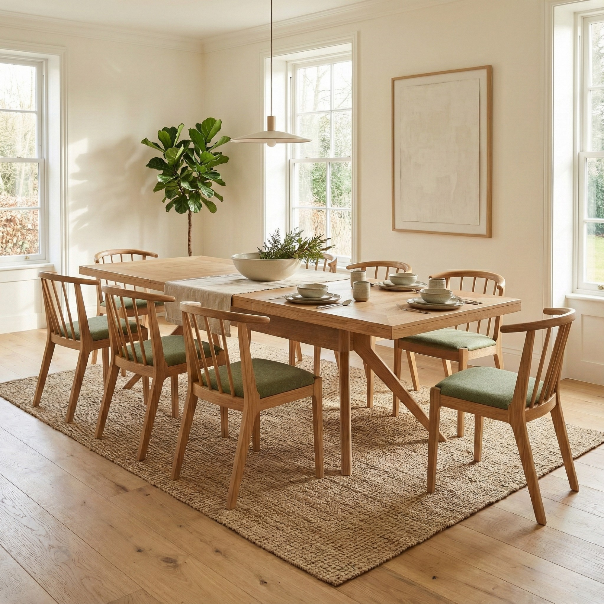 Natürel meşe yüzeyi, doğanın yalınlığını ve zarafetini modern çizgilerle buluştururken, dinamik ayak formu ve üç aşamalı açılabilir yapısı tam esneklik sunar.