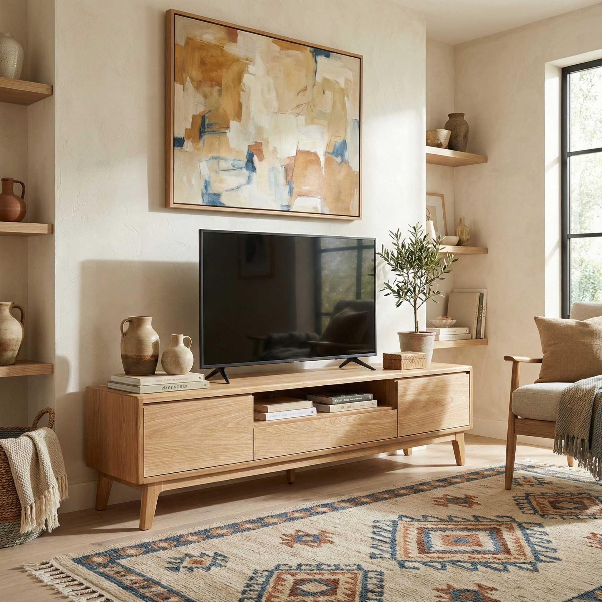 Zarif ve dayanıklı Avila TV Ünitesi, doğal meşe dokusuyla evinize şıklık katar.