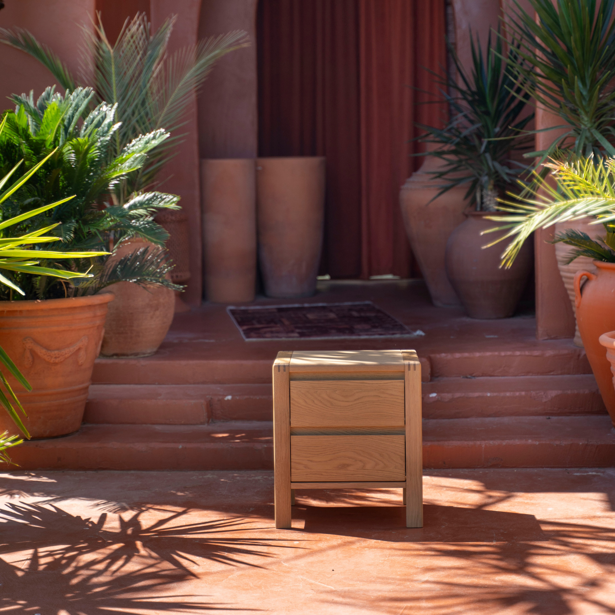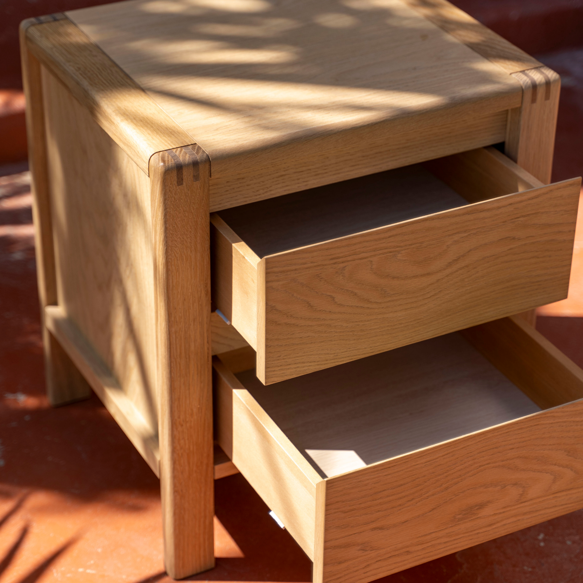 2 çekmeceli kullanım alanını ve estetiği birlikte sunan bu tasarım, Amerikan beyaz meşe masifin sıcak dokusunu dayanıklılıkla buluşturur. E1 Sertifikalı sunta üzerindeki Avrupa beyaz meşe kaplama, sağlıklı ve çevre dostu bir yapı sağlarken düşük formaldehit emisyonu ile insan sağlığını da koruyor.