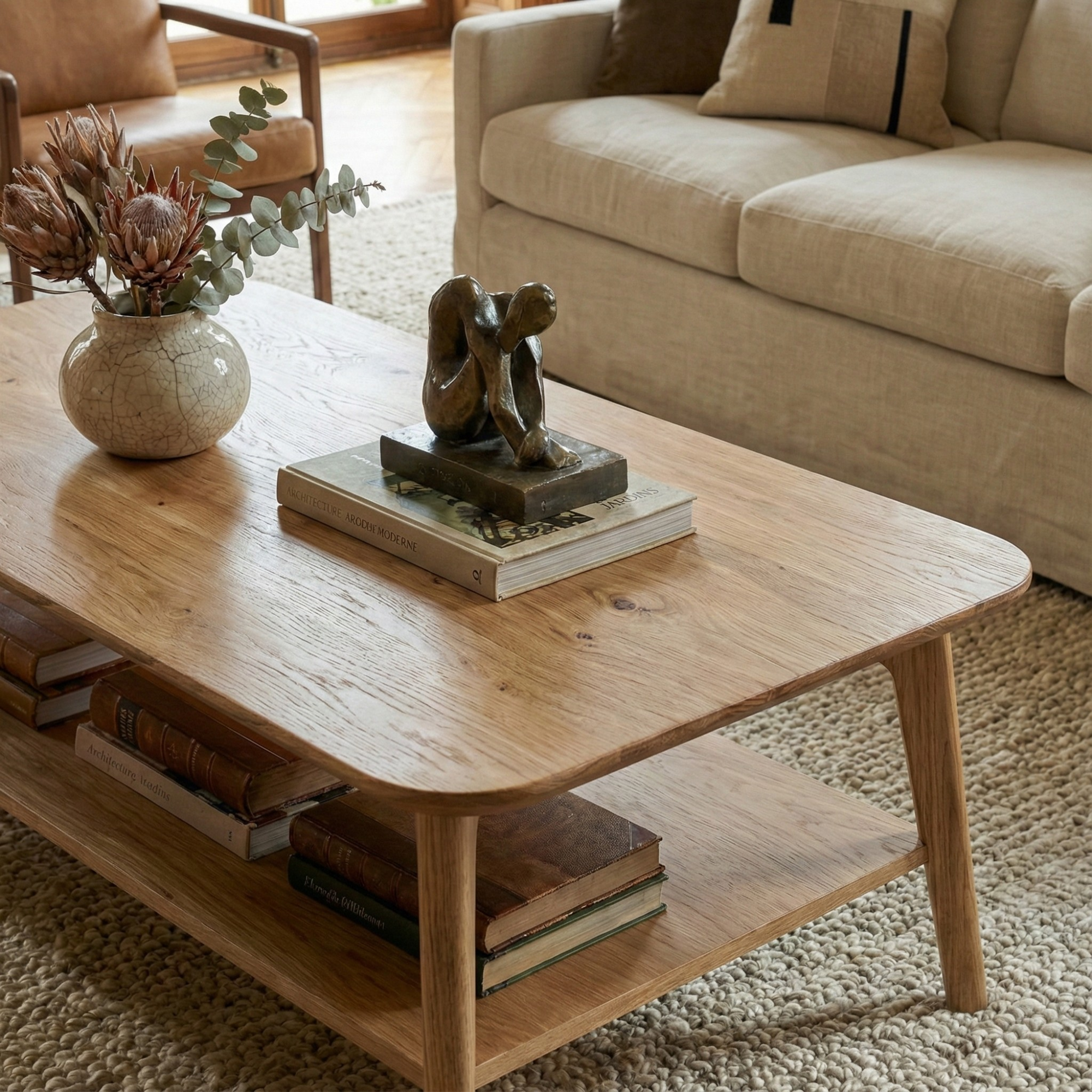 Alt raf detayı, kitap ve dekoratif objeler için işlevsel bir alan sunarken; üst yüzey, günlük kullanıma uygun genişliğiyle konforlu bir deneyim sağlar. Shizen Kahve Masası, yaşam alanlarında sadelikten gelen şıklığı arayanlar için tasarlandı.